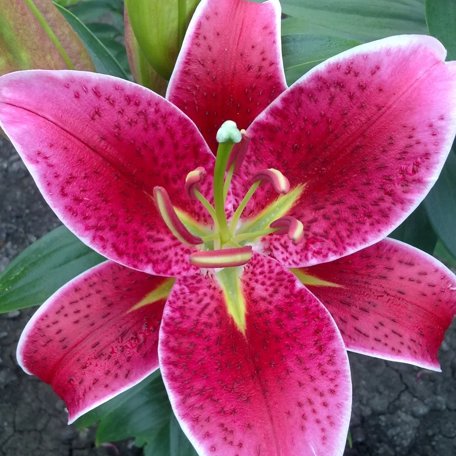 - Характеристики малиново-красный с темным крапом,зеленое горло,край белый