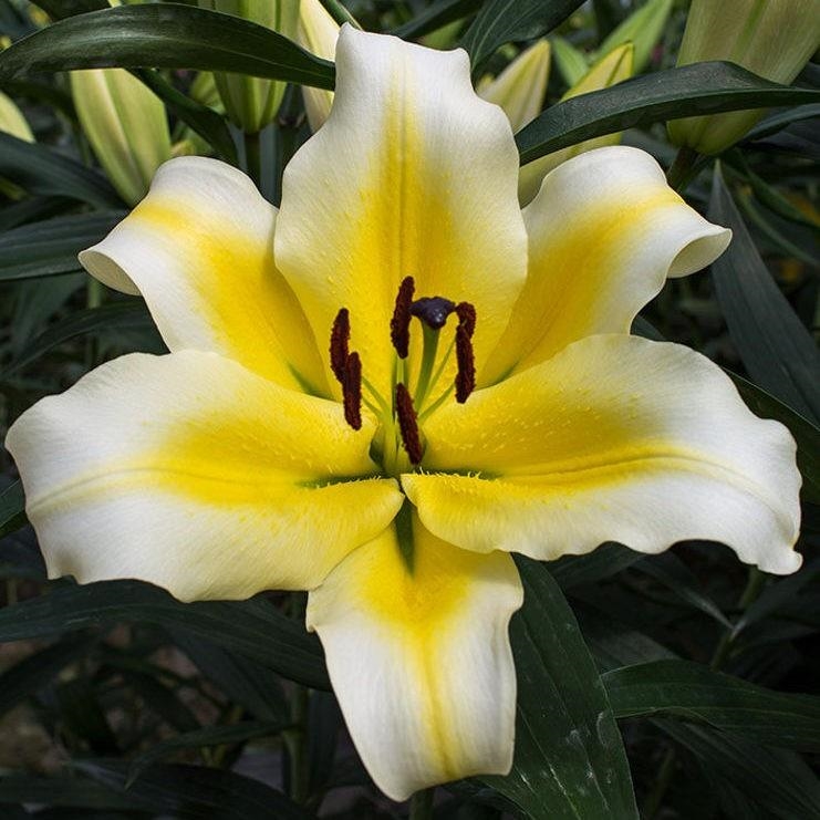 Луковицы лилии восточной Галапагос (Lilium hybrid oriental Galapagos) — нежный аристократичный цветок. Это многолетнее растение, которое достигает 120 см в высоту. Его удобно выращивать в саду или в теплице, для декора клумб или под срез. Особенно уместно оно смотрится в букетах и гармонично дополняет любую цветовую гамму. Период цветения лилий приходится на последние месяцы лета. На стеблях одновременно распускаются целые букеты крупных (до 25 см в диаметре) цветов. Лепестки матовые, со слегка волнистыми краями. Лилия восточная Галапагос окрашена в классический белый цвет с теплой желтой полосой в центре и такими же вкраплениями.