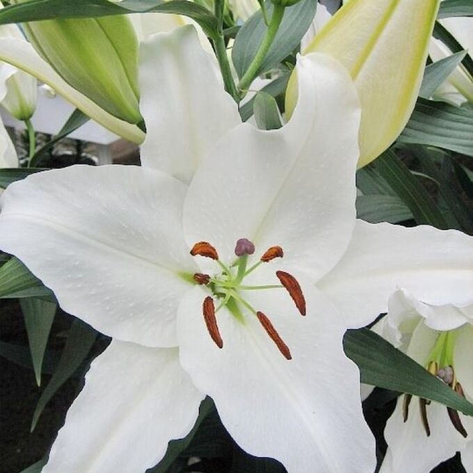Луковицы лилии восточной горшечной Тру Эмоушн (Lilium True Emotion) — это яркая экзотика для украшения клумб и придомовых участков. Кусты этого сорта пышные, с прочными стеблями, особенно ценятся за устойчивость к заморозкам. Также они редко подвергаются воздействию инфекционных заболеваний и вредителей. Главное украшение лилии — это ее цветы, которые в конце лета начинают распускаться в большом количестве. Лепестки этого сорта классического белого цвета, с контрастными темными пыльниками. Они достигают 16 см в диаметре и появляются на цветоносах целыми букетами. Благодаря обильному цветению Лилия восточная горшечная Тру Эмоушн подходит не только для групповых, но и для одиночных посадок.