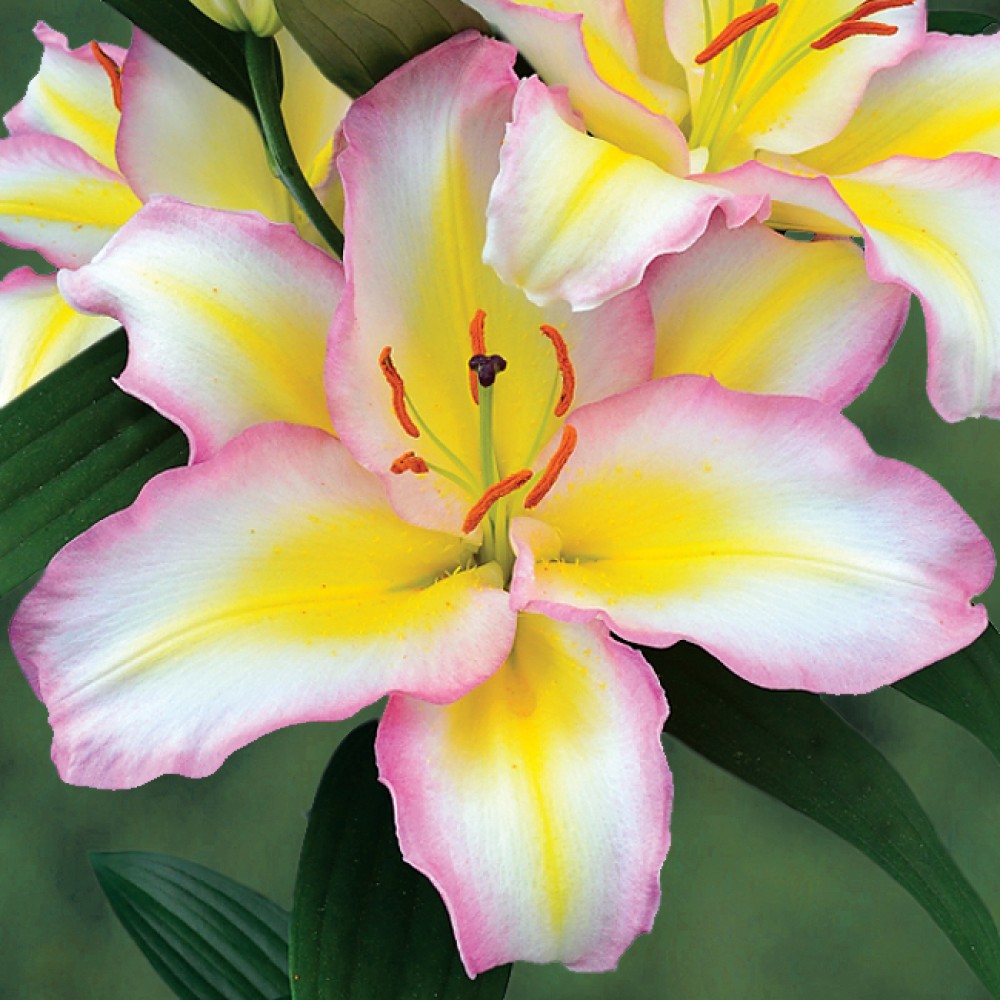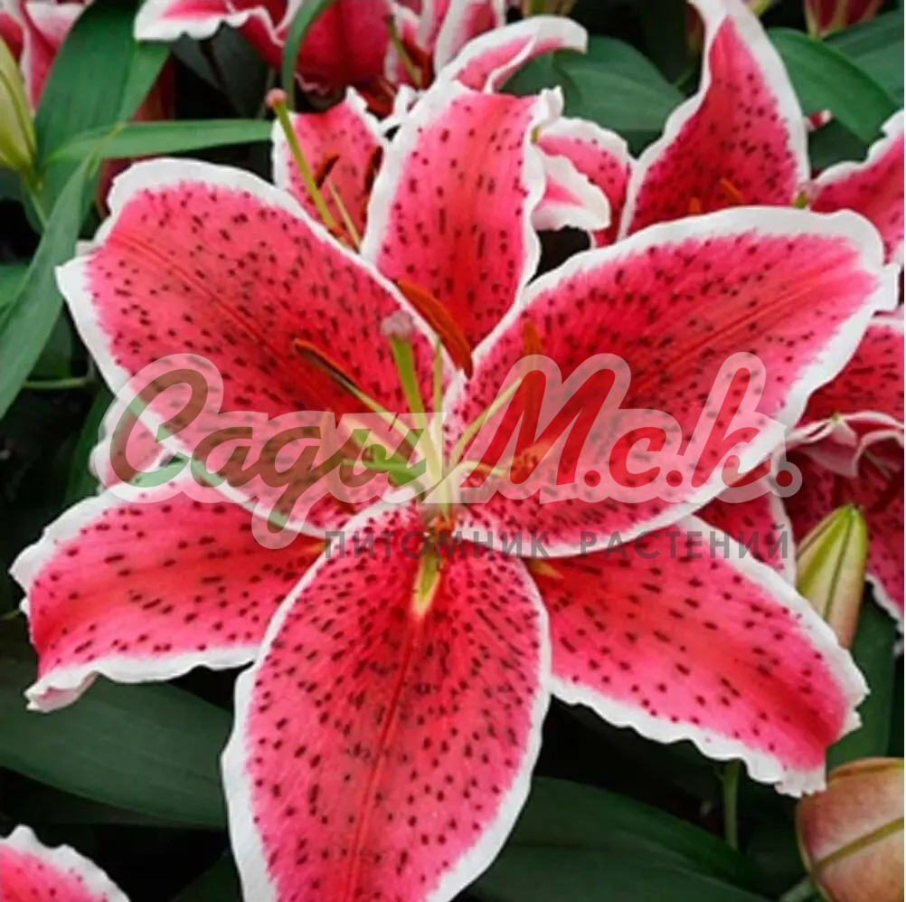 Луковицы лилии восточной Капитан Триколор (Lilum oriental Captain Tricolor) — решение для любителей пастельных тонов и необычных сочетаний. Это высокое растение, до 120 см в длину, популярное для украшения клумб и выращивания под срезку. С уходом за ним справится даже новичок: кусты отлично переносят жару и морозы, легко остаются зимовать в открытом грунте, под укрытием. В середине и в конце лета начинают распускаться бутоны — они достигают 18–20 см каждый и появляются в больших количествах на всех цветоносах. Цветы сразу привлекают внимание необычным окрасом и ярким ароматом. Они белые, с волнистой малиновой каймой и желтой продольной полосой в центре. Образ Лилии восточной Капитан Триколор также дополняет контрастные темные пыльники.