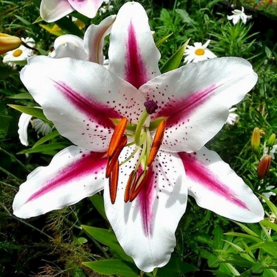 Луковицы лилии восточной Хати (Hati) подарят изящные растения с крупными цветками двухцветной окраски. Полностью раскрытый цветок достигает 20 сантиметров в поперечнике. Широкие лепестки со слегка отогнутыми кончиками окрашены в белый цвет. По его центру проходит широкая малиновая полоска, иногда она занимает почти всю площадь листовой пластины. Интенсивность расцветки зависит от количества солнца, которое доступно лилии. Высота лилии этого сорта 100 сантиметров, на конце стебля формируется от 2 до 4 бутонов. Цветение у Лилии восточной Хати наступает во второй половине лета.