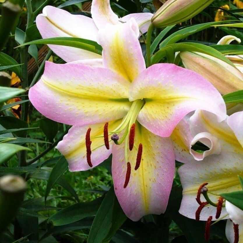 Лилия восточная Кзотико (Lilium oriental hybrids Xotica) – весьма большие светло-лиловые цветы с мягко-желтой полосой по середине волнистого лепестка. Высота растения 70-90 см, в цветоносе находится 6-9 цветов.