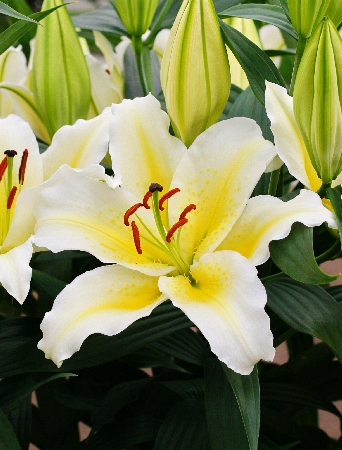 Лилия Cherbourg - настоящее украшение цветника. Цветы большие, душистые, лепестки - волнистые. Окрас лепестков желтый по центру и кремово-белый по краям. Сорт предпочитает нейтральную или слабокислую хорошо, дренированную почву. Эта лилия устойчива к грибным заболеваниям, зимостойкая. Высота растения - 70-80 см, диаметр цветка - 18-22 см. Период цветения - июль-август.