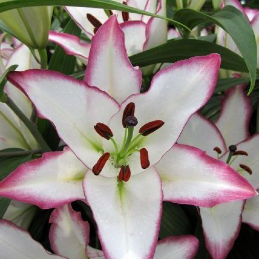 Лилия восточная Зе Эдж (Lilium oriental hybrids The Edge) – неприхотливый посадочный материал. Со временем на рыхлых плодородных почвах и регулярном поливе он превращается в настоящую восточную красавицу, крупные цветки которой пестрят экзотическими красками. На белоснежном фоне каждого лепестка прослеживается зеленоватая жилка у основания, а края лепестков оформлены в ярко-розовом оттенке. При высадке Лилии восточной Зе Эдж высотой порядка 90-110 см необходимо подумать, какие растения использовать в качестве их фона, а какие расположить рядом. Здесь может быть множество вариаций, поэтому смело экспериментируйте.