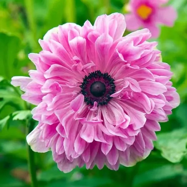 Луковицы анемоны махровой Пинк (Pink) подарят прекрасные яркие цветы уже в мае. Неприхотливую Ветренницу размещают в тени крупных растений, чтобы нежные лепестки не выгорали на солнце. Многочисленные, слегка растрепанные, ярко-розовые головки анемон прекрасно сочетаются с насыщенной кружевной зеленью листвы. Высота растения всего 30 сантиметров. Анемона махровая Пинк неприхотлива, но нуждается в зимнем укрытии на территориях севернее Нижнего Поволжья. Соцветия у Пинка крупные, многочисленные узкие лепестки розовые, сердцевина цветка состоит из черных тычинок, которые только подчеркивают яркость основного цвета.