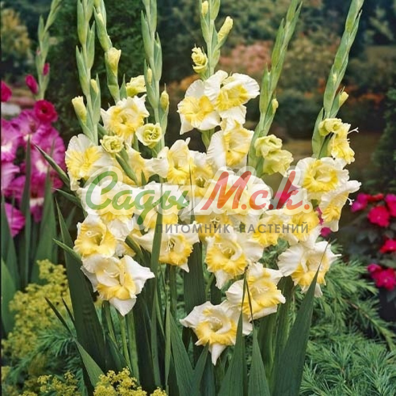 Луковицы гладиолуса крупноцветкового Багги (Buggy), высаженные на клумбе, наполнят её свежестью и весенним настроением. Цветки имеют двойную окраску: белоснежная юбка и ярко-жёлтые центральные лепестки. Бутоны в точности повторяют форму и цвет нарцисса, позволяя имитировать цветение этого растения во второй половине лета. Как и все крупноцветковые гладиолусы, Багги формирует цветонос длиной более 60 сантиметров. На нём распускается до 14 цветков одновременно. Высаженные на клумбе группами по 5 или 8 штук, Гладиолусы крупноцветковые Багги выглядят живописно и празднично.