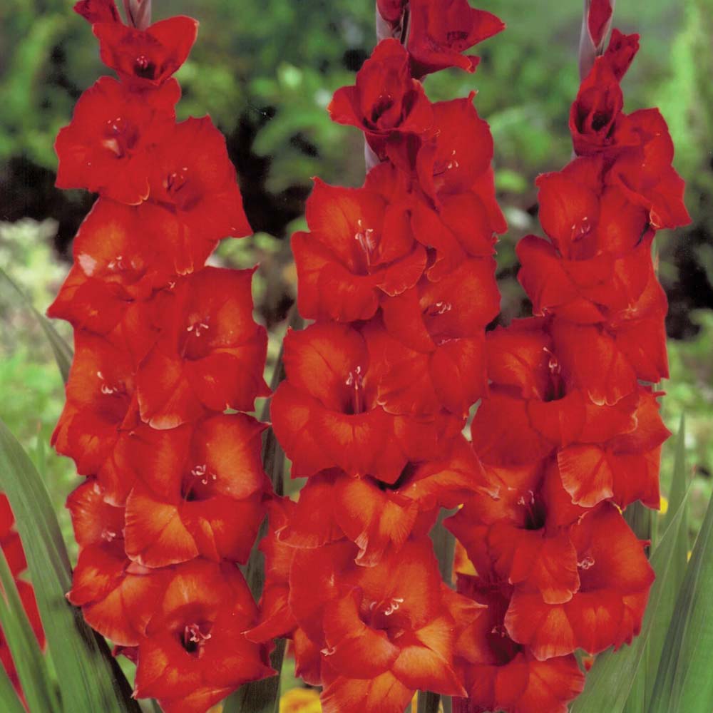 Рассада и саженцы гладиолуса крупноцветкового Браун Шугар (Gladiolus) выпускают вертикальные стебли с цветоносами. Воронкообразные цветки кирпично-красного цвета густо заполняют стебель. Листья у гладиолуса тонкие и прямые, находятся в нижней части растения.