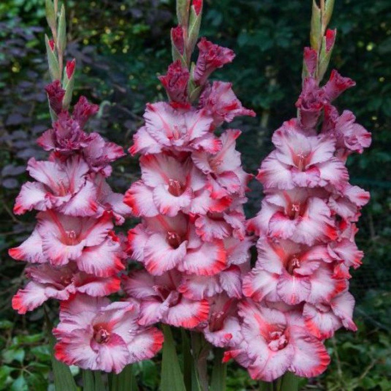 Луковицы гладиолуса крупноцветкового Грейхаунд ‒ необычное многолетнее растение для озеленения клумб и дачных участков, а также для среза. Высота кустов составляет 80‒110 сантиметров. Они крупные, эффектные, сразу привлекают внимание в комплексных композициях. На одном цветоносе может формироваться одновременно несколько цветов, в течение теплого сезона постоянно образуются новые бутоны. Лепестки отличаются необычной расцветкой ‒ они светло-фиолетовые, с яркой красной каймой и сердцевиной. Гладиолус крупноцветковый Грейхаунд подходит для оформления букетов и долго хранится после среза.