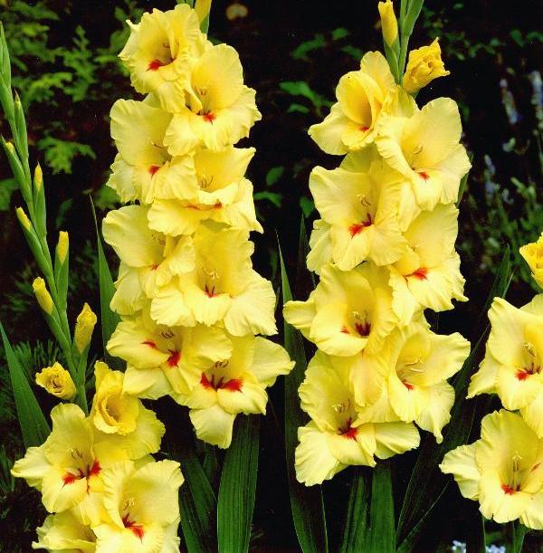 Гладиолус крупноцветковый Платини (Gladiolus Platini) – появляется с гроздьями великолепных золотисто-желтых цветов. Каждый жизнерадостный цветок украшает фирменная красная маркировка, что делает этот эффектный сорт поистине выдающимся. Каждый крепкий стебель достигает 60 дюймов в высоту и сопровождается прекрасной, копьевидной зеленой листвой. Гладиолус Платини великолепно работает при большом количестве солнечного света и влажной, хорошо дренированной почве. Чередуйте посадки каждые две недели в течение полного сезона непрерывного цветения. Соедините Гладиолус крупноцветковый Платини с другими красочными гладиолусами вдоль бордюров или срежьте и принесите блеск в помещение.