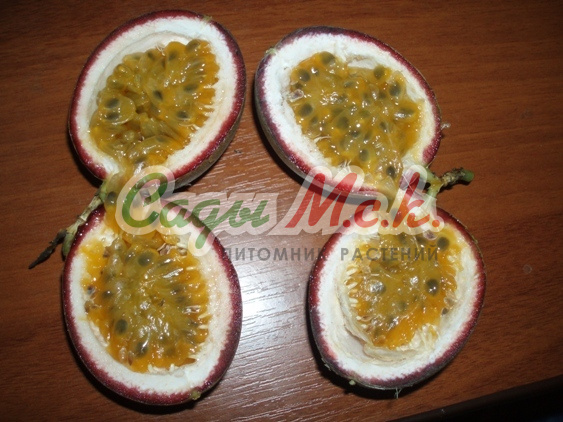 Маракуйя Purple Granadilla - цветущая все лето быстрорастущая субтропическая лиана. Листья светло-зеленые, цельные. Цветки нежные, белые со светло-фиолетовыми оттенками, переходящие в фиолетовый цвет у основания. Плоды сливовидной формы, темно-синие с фиолетовыми оттенками. Мякоть съедобная, сочная, сладкая.