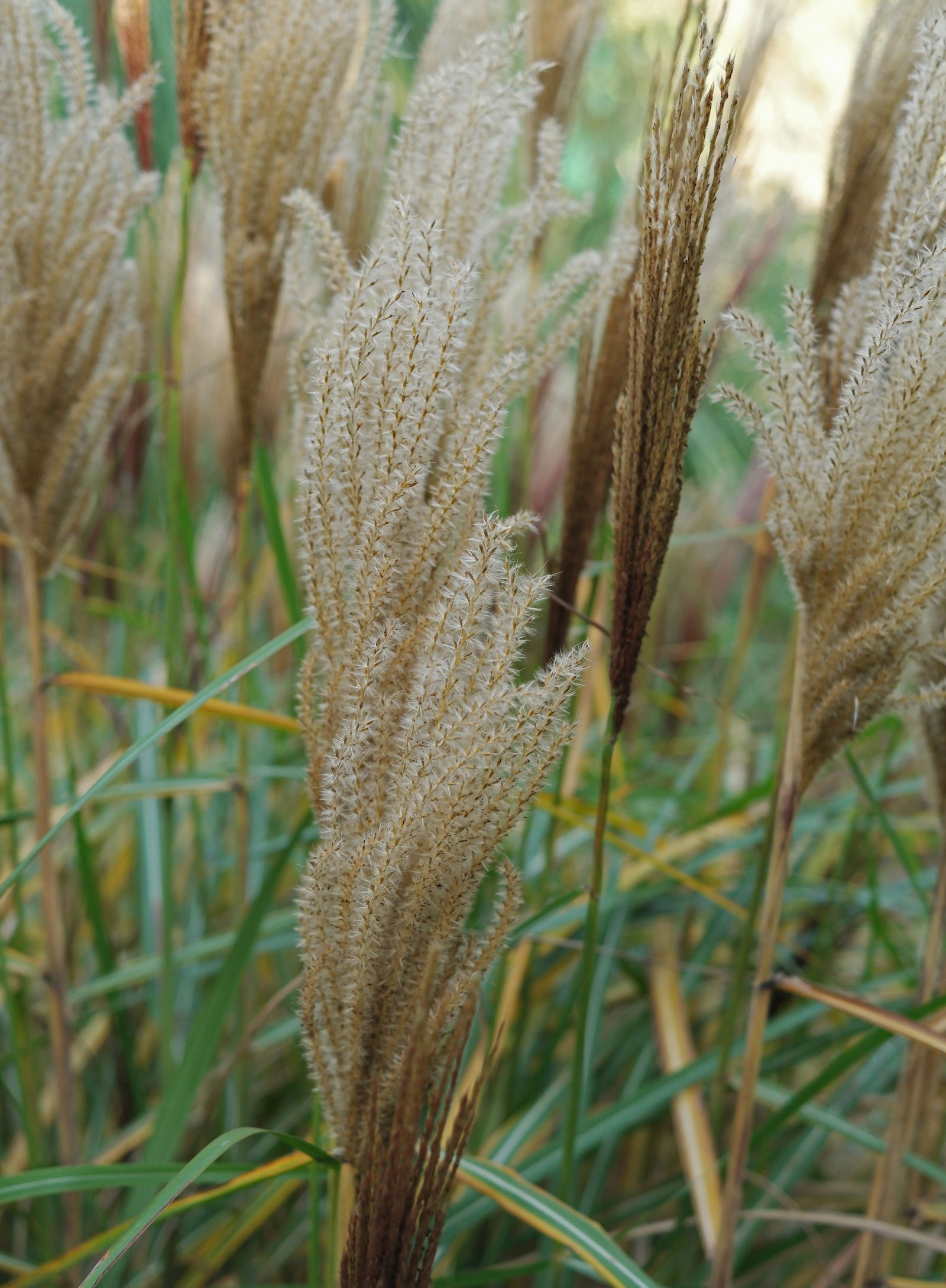 Мискантус китайский Ротфедер - высота растения 180 см, листья темно-зеленые, узкие, цветки красно-коричневые. Мискантусы служат хорошим украшением берега водоемов, их высаживают отдельно или группами в миксбордерах, рокариях, возле газонов. Растения декоративны с весны до начала зимы. Осенью их листва окрашивается в различные оттенки желтого, коричневого, бордового цветов. Пушистые соцветия используют для создания флористических композиций.