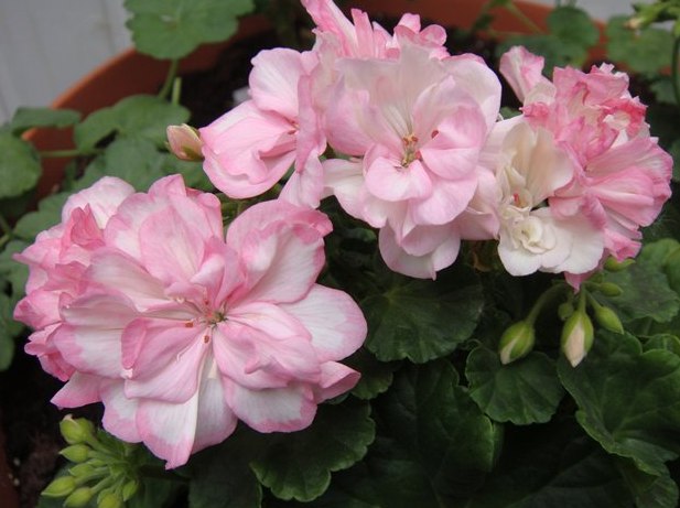Пеларгония Lilac Mist - пышный небольшой кустарник. Листья маленькие, темно-зеленые. Цветоносы тонкие, светло-зеленые. Цветки крупные, махровые, удивляют своей окраской: она меняется от чисто-белой в центре до розовой по краям лепестков при хорошем освещении. Цветет этот сорт обильно и продолжительно.