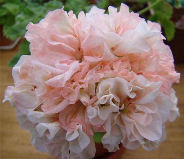Пеларгония Nettlestead - махровая зональная карликовая пеларгония. Растение хорошо кустится. Куст может быть высоким. Цветки махровые, потрясающей окраски с множеством разных оттенков - от чисто-белого, кремового, лососевого до насыщенно-розового. Соцветия-шапки средних размеров. Цветение продолжительное.