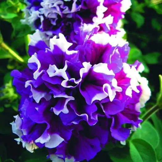 Огромные, махровые цветки (10-13 см), с «кринолинами» бархатных лепестков, глубокого фиолетового тона с белыми пятнышками по краю. Растение компактное, ветвистое, диаметром 25-30 см, с небольшими аккуратными листиками. Эта раннецветущая прелестница станет достойным украшением клумб, вазонов, балконных ящиков. Выращивают рассадным способом. Посев проводят с января по апрель, поверхностно, под стекло (после появления всходов стекло убирают). В зимние месяцы (январь-февраль) досветка обязательна. При ранних сроках посева цветение начинается в мае, что очень удобно для выращивания растений на балконе, закрытых террасах, патио. Без дополнительного освещения петунию высевают не раньше марта. Всходы появляются через 7-12 дней. На постоянное место высаживают, когда минует опасность заморозков. Светолюбива и достаточно засухоустойчива. Предпочитает легкие, плодородные, хорошо дренированные почвы. Петунии можно выращивать в течение нескольких лет, сохраняя зимой в освещенном помещении (растение сильно обрезают, t не более +12°С, умеренный полив). Цветет обильно с начала мая до заморозков.