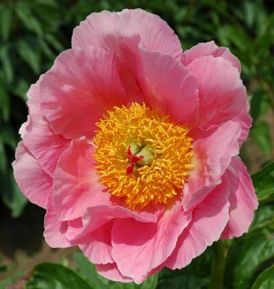 Травянистый пион Salmon Chiffon простой формы. Три ряда внешних крупных светло-оранжево-розовых лепестков окружают центр с жёлтыми тычинками. Романтичный вид. Высота растения 75 см. Ароматный. Раннего срока цветения.