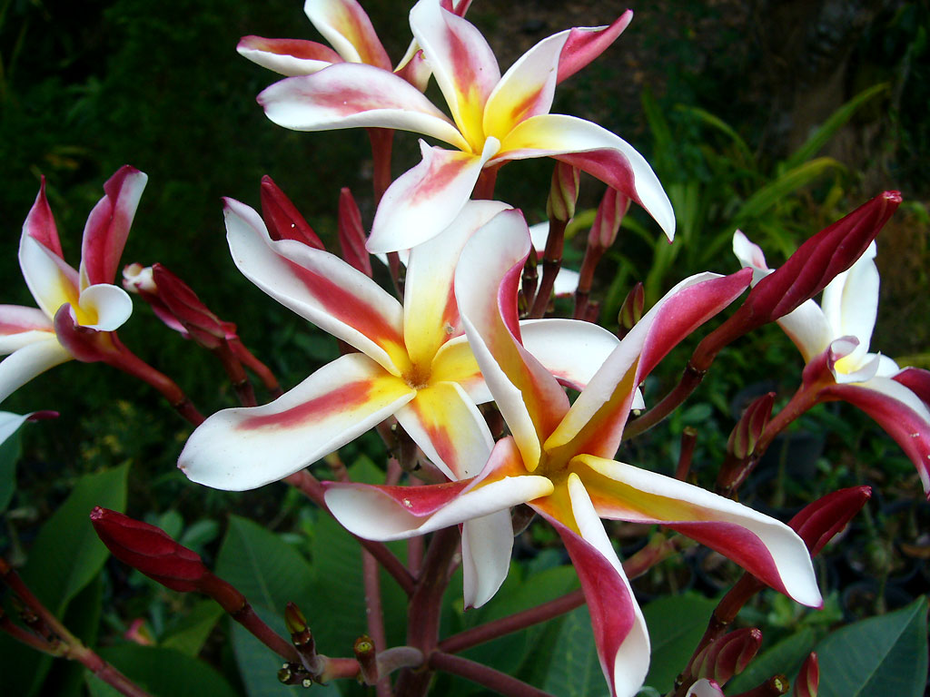 Plumeria Madame Poni - сорт среднерослый. Цветки достигают 10 см в диаметре. Лепестки продолговатые, заостренные, узкие, белые с красной центральной полосой. Центр каждого цвета отличается желтоватым оттенком. Запах приятный, сладкий.