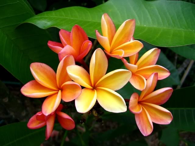 Plumeria Orange Hawaii - экзотическое растение. Листья огромные, длинные, заостренные, глянцевые. Цветки 5-лепестковые, средних размеров, желто-оранжевые с массой светлых и темных оттенков, обладают уникальным приятным ароматом.