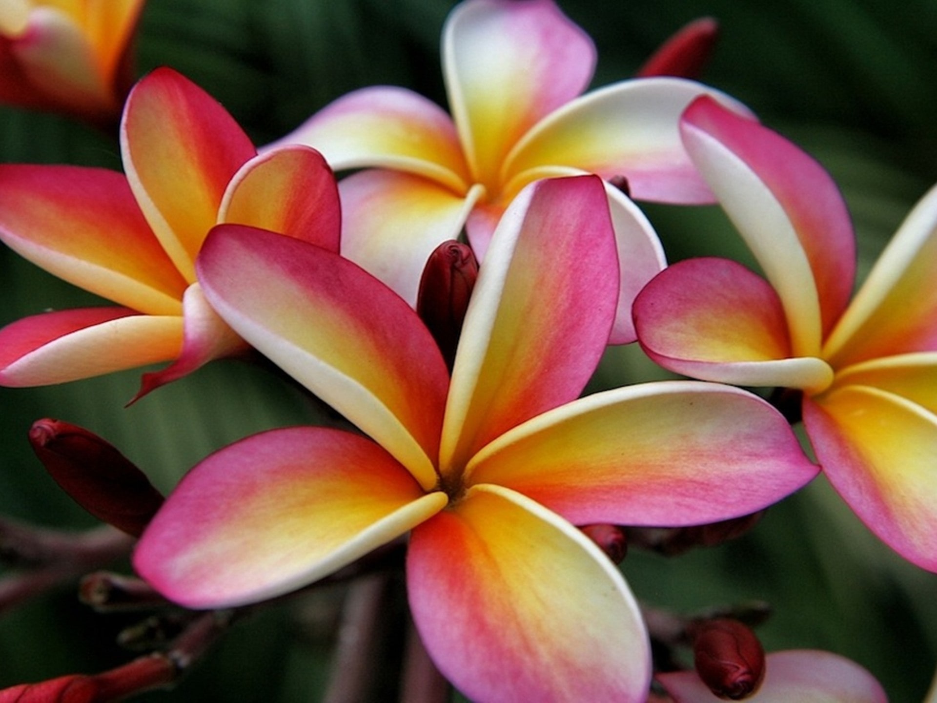 Plumeria Three Kings - небольшое тропическое деревце. Отличается необычно красивыми, нежными, ароматными цветками. Лепестки розовые, ближе к основанию желтые, покрыты насыщено-пурпурными пятнами, которые придают цветку декоративности.