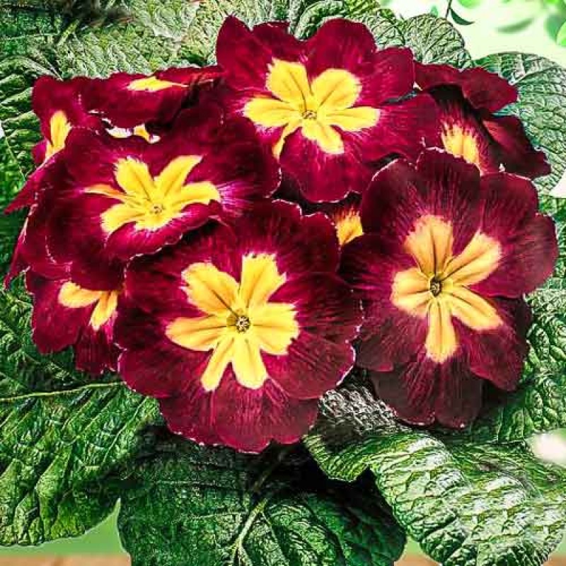 Примула Meteor - многолетнее растение. Листья прикорневые, цельные. Цветки двухцветные, крупные, во время цветения образуют «шапку» и полностью закрывают листья. Примула предпочитает полутенистые места и рыхлые, достаточно увлажненные почвы с добавлением перегноя. Большого ухода не требует.