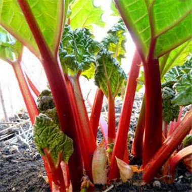Ревень Champagne– многолетнее травянистое растение, которое относится к семейству Гречишные. В высоту достигает до 100-120 см. Растет очень быстро. Вырастает из толстых коротких корневищ и образует длинные, сочные темно-красные стебли и треугольные листовые пластинки с весны. Цветочные стрелки начинают появляться уже на второй год. Летом распускаются белые цветки, которые спустя некоторое время сменяются семенами. Черешки собирают спустя год - два после посадки растения. Листья крупные, высокодекоративные, достигают до 1 м в диаметре. Их цвет зелено-красный.
