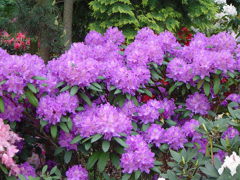 Рододендрон Alfred - густой кустарник, обильно цветущий, не превышающий обычно 160 см. Цветы фиолетовые с волнообразными лепестками, жёлто-зелёным узором на фоне более светлой сердцевины, раскрываются в конце мая- начале июня.