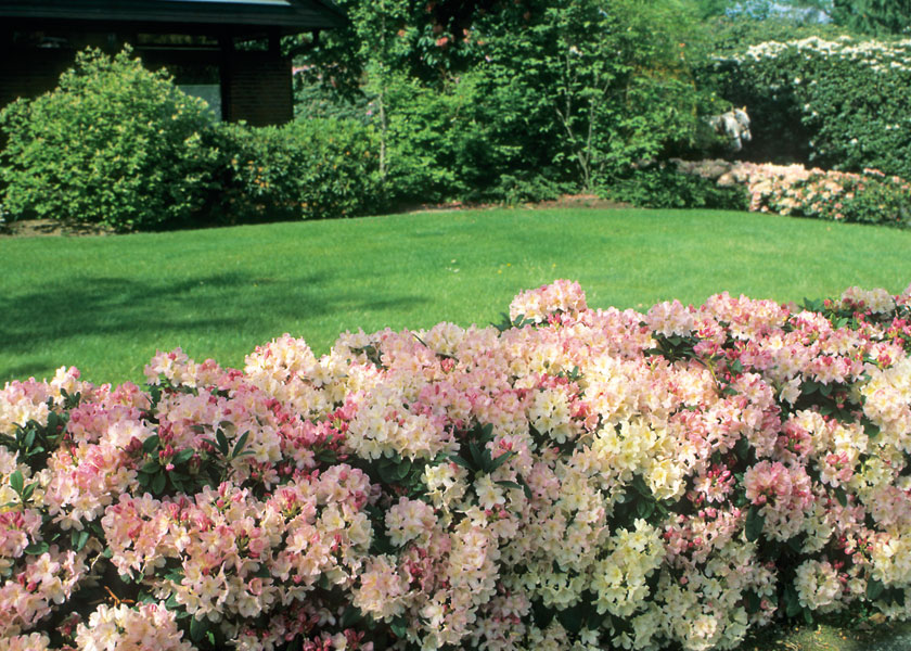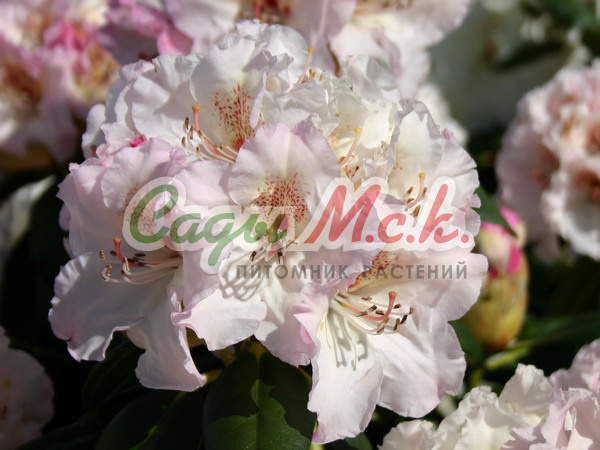 Рододендрон Dagmar - вечнозеленый кустарник. Листья крупные, красивые, цветки - очень эффектные, бело-розовые с золотисто-желтым горлом, гофрированные по краю, в больших соцветиях до 15 цветков. Цветет в мае, в тёплую погоду имеет лёгкий, приятный аромат.
