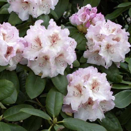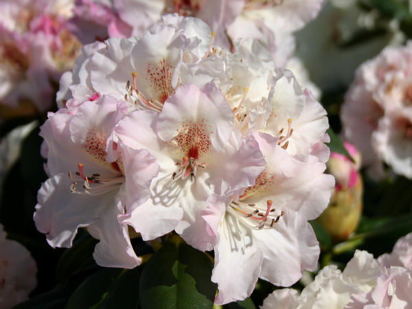 Родендрон гибридный Симона. Куст высотой 120 см. Цветки кремово-розовые с бордовым пятнышком, лепестки с волнистым краем. цветет в начале мая. Зимостойкость до -18°С. Местоположение: полутень, тень. Не так давно рододендрон считался исключительно южным растением. Ситуация изменилась с появлением гибридных морозостойких сортов. Эти высокодекоративные кустарники уже стали популярны среди отечественных цветоводов.