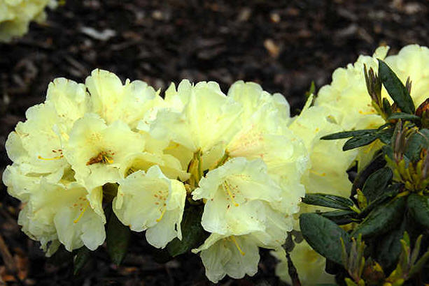 Рододендрон Goldkrone - слабо рослый, но густой сорт, растет в ширину. Густая, ярко-зеленая листва. Желтая окраска блюдцевидных, колоколообразных цветков, к центру приобретает лимонный оттенок, верхние лепестки венчика украшены небольшим коричневым узором. Цветение средне-раннее или позднее.