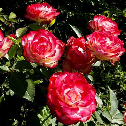 Яркая окраска Nostalgie привлекает к себе внимание уже издалека. Затем нос улавливает сильный, сладкий аромат. Это превосходная чайно-гибридная роза, особенно популярная в Германии. Цветки крупные, чашевидные, с закрученными белыми лепестками в центре и ярко-вишнево-красными по краям. Цветки раскрываются медленно, долго стоят в срезке, и хорошо держат цвет. Лепестки имеют слегка волнистый край, так что цветок сохраняет привлекательность на всех стадиях роспуска. Куст компактный, не слишком высокий, аккуратный, с темной, блестящей, здоровой листвой. Хорошо цветет повторно, и отлично подходит для массива на клумбе.