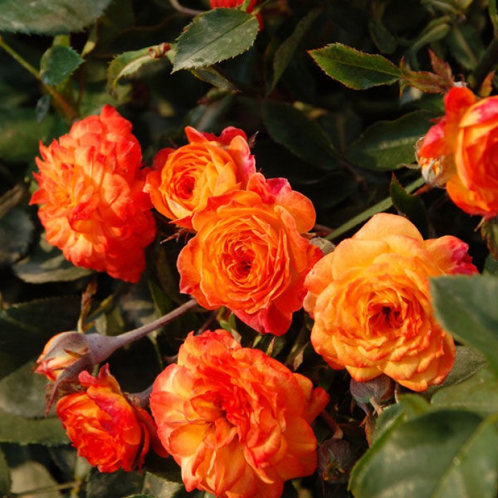 Роза Sunmaid - декоративный, обильно цветущий сорт. Отлично смотрится при посадке в контейнеры, вдоль бордюров, в небольших цветниках. Кусты невысокие, очень густые. Цветки быстро раскрываются из бутонов, усыпая весь куст, обычно растут гроздьями по 3-10 штук на стебле. Цветок небольшой, лепестки округлой формы, тесно прижаты друг к другу. Окрас сначала золотисто-оранжевая, позже цветки темнеют и выгорают, приобретая яркий красный оттенок.