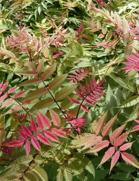 Кустарник с плотной необычайно красивой легкой кружевной листвой. Весной на кусте можно одновременно наблюдать настоящую цветовую радугу. Длинный лист состоит из многочисленных мелких листочков с зазубренными краями зелеными в нижней части, с золотистым напылением ближе к верхушке и ярко-розовыми верхушечными листочками- такой окрас длится до конца мая, а летом листва становится зеленой. Цветет в июне-июле сливочно-белыми соцветиями. Не нуждается в специальном уходе и обрезке. Высота растения: 1,5 м. Преимущество этого сорта в том, что он компактный , у него плотная листва и это обеспечивает хороший почвенный покров