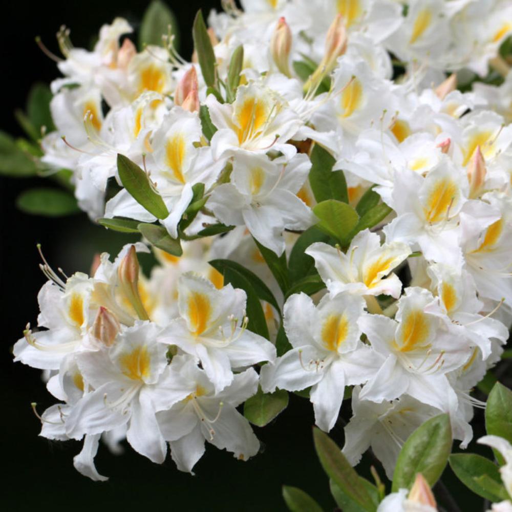 Азалия Schneegold - листопадный среднерослый кустарник с округлой кроной, в высоту растет до 1,0 м, разрастаясь в диаметре до 0,8-1,0 м. Листья светло-зеленые, овальные, осенью листва становится оранжево-желтой. Цветки крупные, раскрытые, белоснежные с красивым золотистым пятном из штрихов на верхнем лепестке. Цветение обильное, продолжительное.
