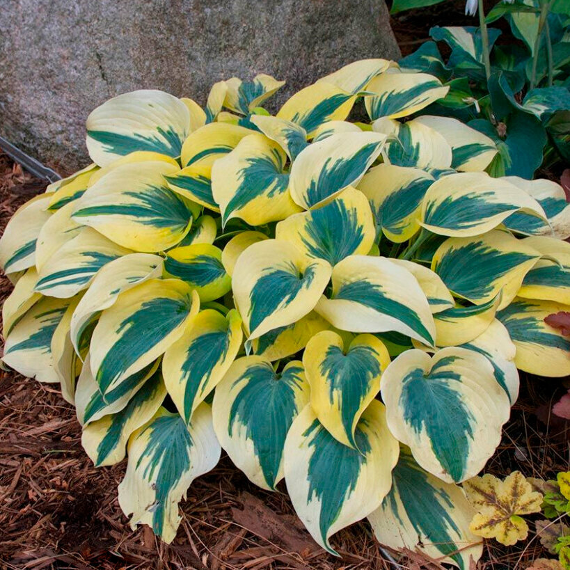 Хоста гибридная Отем Фрост с ранней весны до поздней осени будет радовать эффектным внешним видом. Широкие сердцеобразные листья имеют двойную окраску: середина темно-зеленая, а края – желтые. Растение предпочитает тенистые участки, но также приспосабливается к солнечным местам. При благоприятных условиях данный сорт способен расти на одном месте до двух десятков лет.