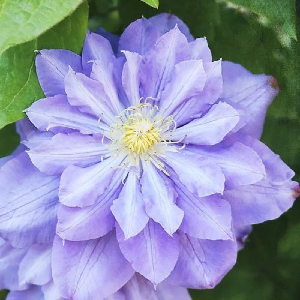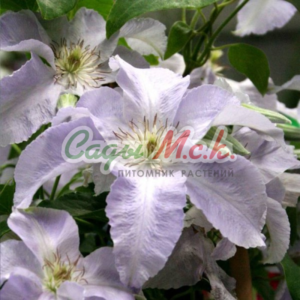 Клематис Блю Даймонд – крупноцветковый сорт клематиса польской селекции. Плети достигают 2 м. Цветки 10-12 см диаметром, махровые, бело-голубые, более насыщенного оттенка по краям и постепенно бледнеющего к центру. Лепестки слегка волнистые, с заостренными кончиками.
