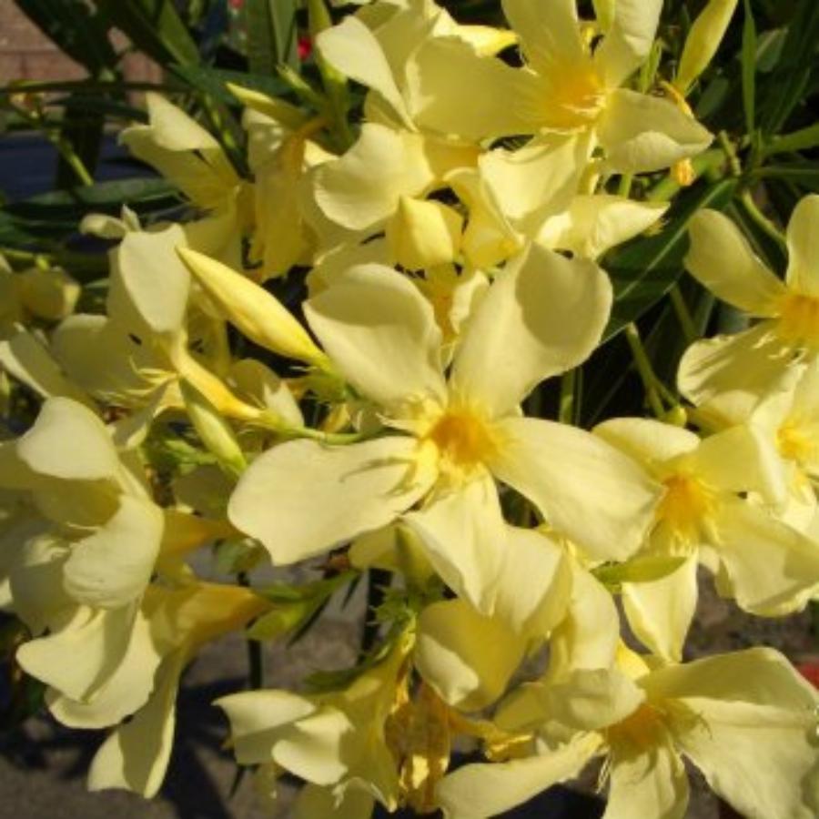 Олеандр обыкновенный Мария Гамбетта (лат. Nerium oleander Maria Gambetta) - эффектный теплолюбивый сорт. Летом зацветает огромными соцветиями, состоящими из светло-желтых однотонных 5-лепестковых душистых цветков с золотисто-желтым центром. Стебли и листья очень темные. Внимание! Олеандр - ядовитое растение, поэтому при его культивировании требуется осторожность.