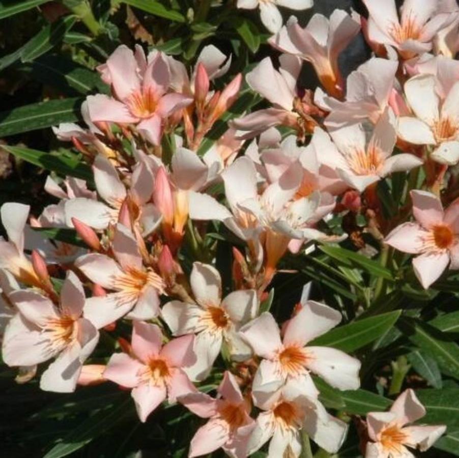 Олеандр обыкновенный Петит Салмон (лат. Nerium oleander Petit salmon) - низкорослый куст. Стебли у него коричневые, мощные, упругие. Листья длинные, темно-зеленые со светлой полосой. Цветки душистые, бело-розово-кремовые, простые с оранжевым центром и слегка закругленными длинными лепестками. Средний диаметр цветков составляет всего 3 см. Внимание! Олеандр - ядовитое растение, поэтому при его культивировании требуется осторожность.