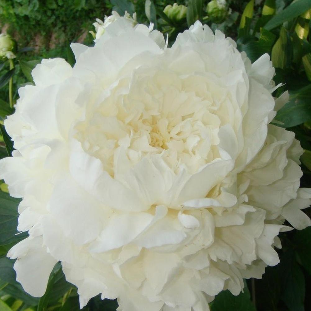 Травянистый пион Mrs. J.V. Edlund -цветок махровый, очень крупный, красивой формы, чисто белый с широкими, воско-образными лепестками, без следов какой-нибудь другой окраски. Ароматный. Куст высокий 120см, стебли жёсткие, листья тёмно-зелёные. Цветение в очень поздние сроки.