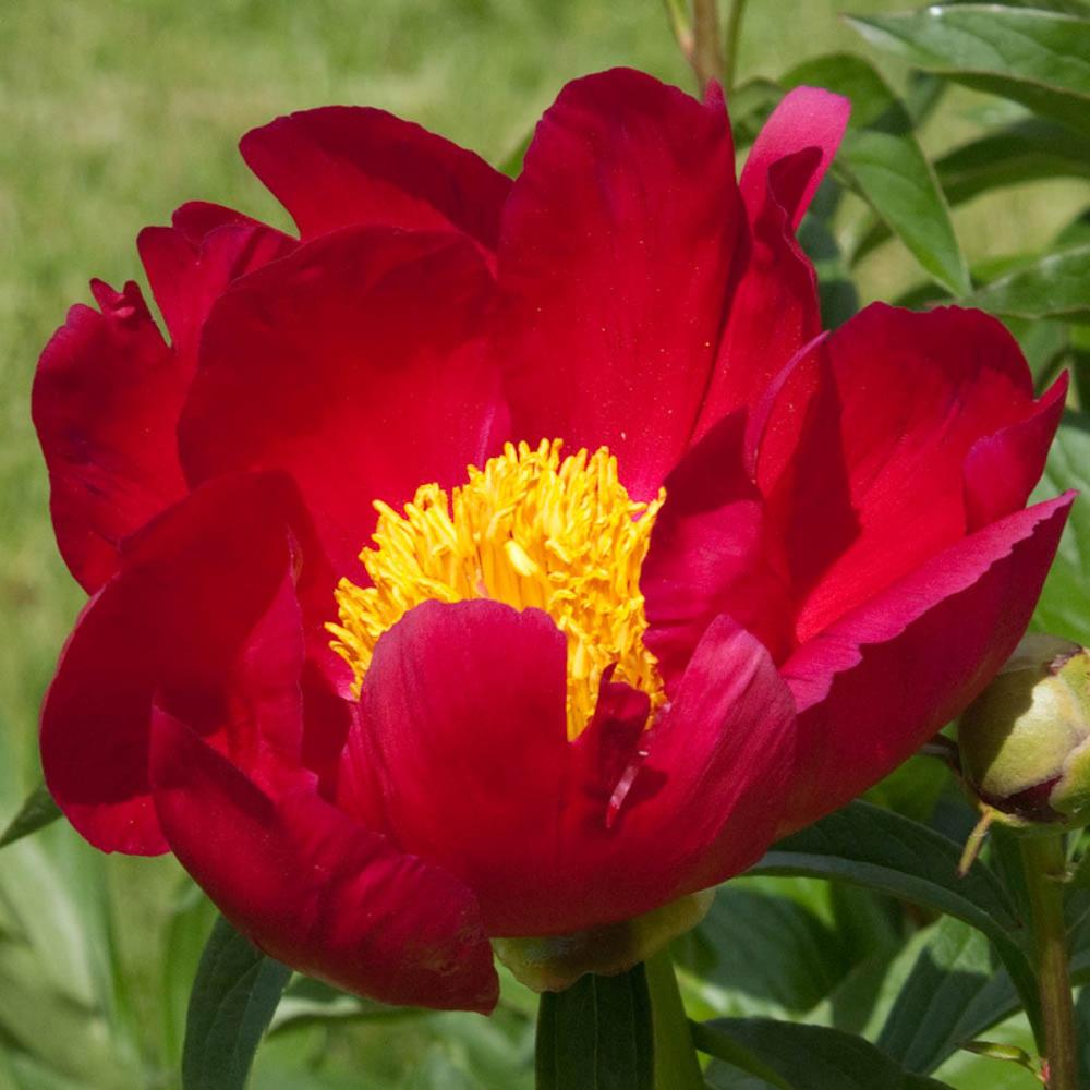 Семена пиона Scarlet O`Hara являются обладателями пышных и ярко-алых соцветий. Их диаметр может достигать восемнадцати сантиметров, при этом бутоны простые и имеют несколько рядов широких лепестков. Данный сорт пиона относится к межвидовым гибридам, высота его стеблей составляет менее метра. В центре бутона в виде огненного шара располагается множество ярких желтых тычинок. Растение очень быстро разрастается, источая нежный и приятный аромат. Срок цветения саженцев очень ранний, в этот период куст покрывается крупными алыми бутонами, одновременно простыми и роскошными.