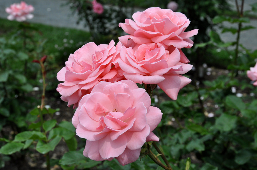 Роза Queen Elizabeth - цветки теплого, нежного розового цвета, не очень махровые, с более темной изнанкой лепестков. Внешние лепестки отгибаются вниз, они слегка волнистые. Полностью раскрывшийся цветок довольно плоский. Листва крупная, темная, округлая. Роза вполне устойчива к болезням. Куст узкий, прямостоячий, благодаря чему подходит для маленьких пространств. Побеги сильные, толстые, с крупными шипами. Хорошо растет на бедных почвах.