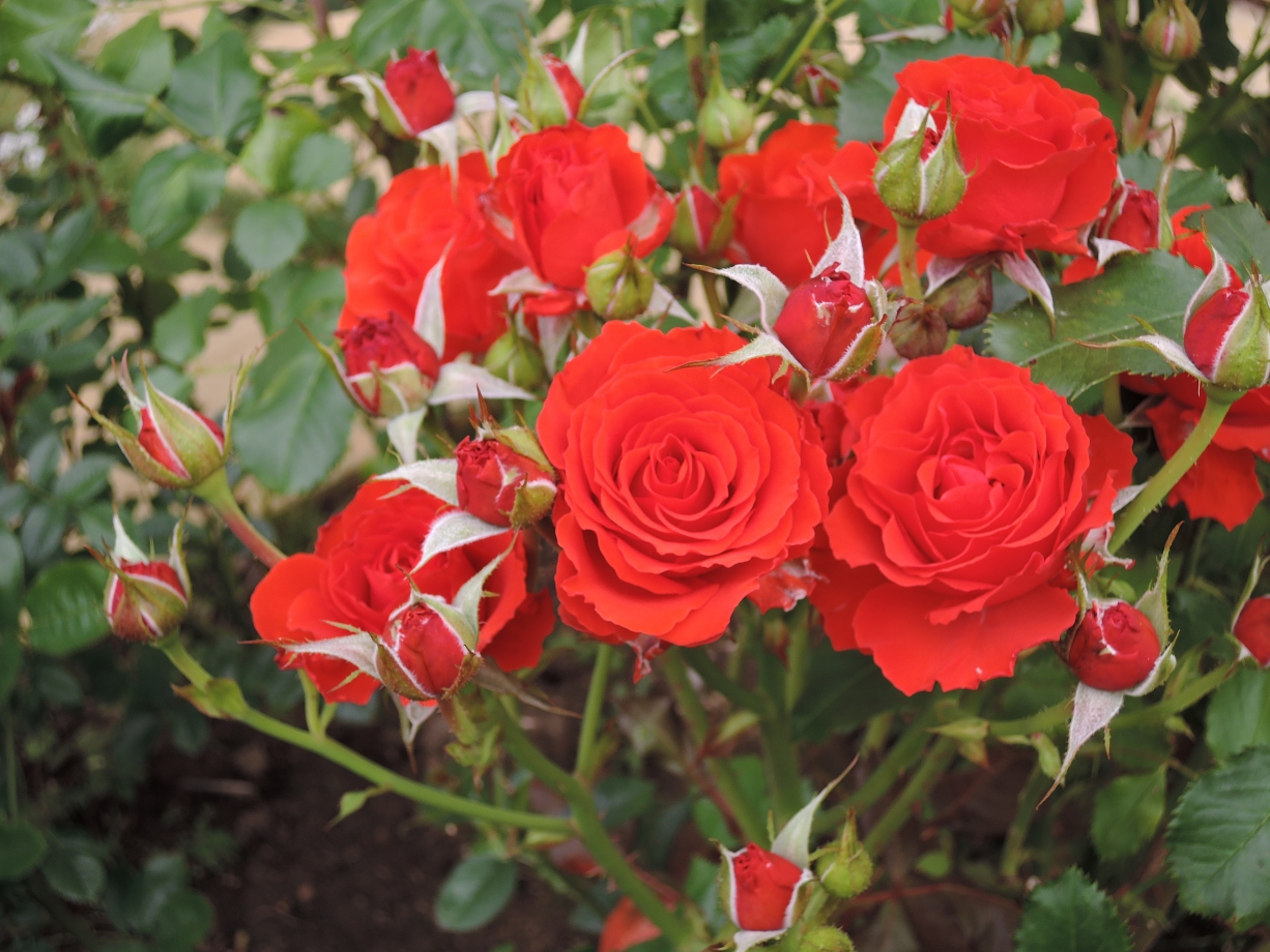 Red Diadem - темно-красные, средние (около 10 см), махровые (30 лепестков) цветки, расположенные в соцветиях (по 5-25 цветков на стебле) на длинных, прочных цветоносах. Цветение обильное. Куст среднерослый, около 1 м высотой, густой, хорошо облиственный. Листья зеленые, средние, кожистые. Сорт зимостойкий, повторноцветущий. Цветение обильное.