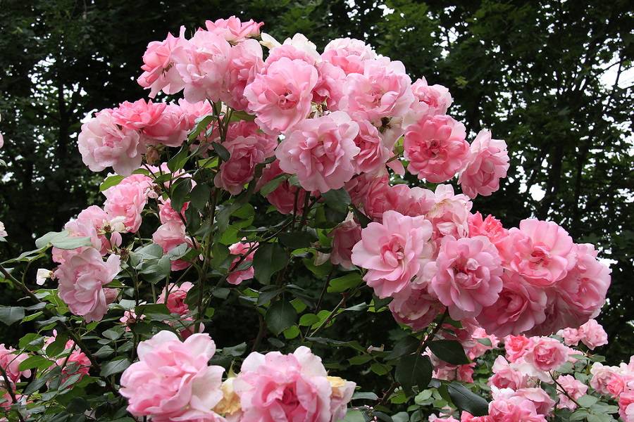 Роза Centenaire de Lourdes - цветки нежно-розовые, к центру светлее, крупные (8—9 см), слабомахровые (15—25 лепестков), очень душистые, в соцветиях по 5—10. Листья округлые, темно-зеленые, кожистые, блестящие, обильные, здоровые.. Цветение очень обильное. Сорт зимостойкий, устойчив к грибным болезням.