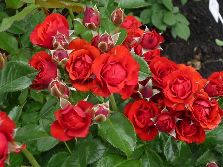 Роза Baby Baccara - цветки яркого оранжево-красного цвета, махровые (50-60 лепестков), диаметром около 5 см появляются на кусте в течение всего лета и собраны в соцветия по 2-5 штук. Цветение обильное, непрерывное, повторное. Куст компактный (высотой 35-40 см), обильно цветущий, с мелкой, блестящей, темно-зеленой листвой. Колючесть побегов средняя.