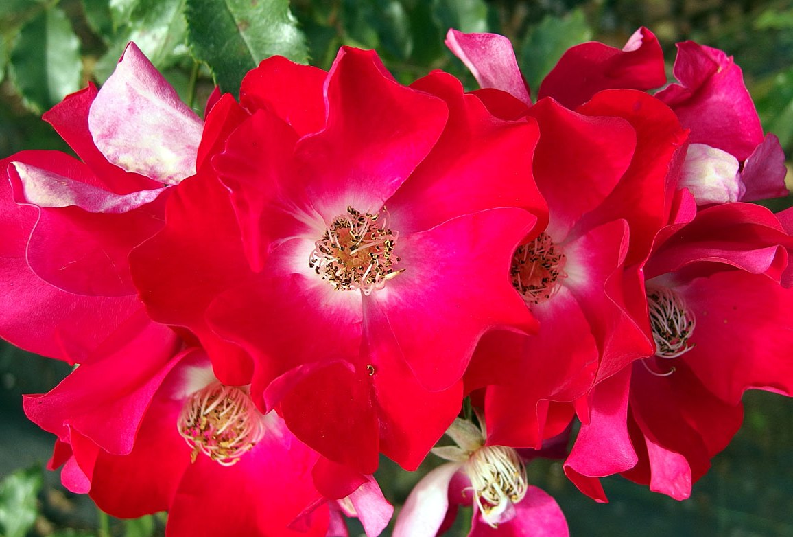 Роза Dortmund - сорт обильноцветущий и выносливый. Удлиненные бутоны раскрываются в крупные, немахровые вишнево-красные цветки (диаметр 11-12 см) с белым пятном в центре и большим пучком ярко-желтых тычинок. Цветки собраны в крупные кисти по 3-11 штук. Куст сильнорослый, раскидистый, высотой до 3 м, с дуговидными, мощными побегами, покрытыми блестящей, очень темной, устойчивой к заболеваниям листвой.
