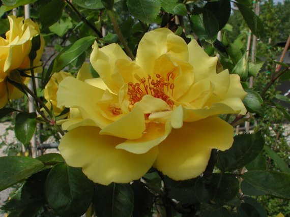 Роза Golden Showers - крупные, махровые (до 30 лепестков) розы. Цветки, раскрывшись, золотисто-желтые, выгорают до лимонных, иногда до кремовых, 9-10 см в диаметре, с волнистыми лепестками и красными тычинками в центре. Появляются по одному или в небольших кистях на концах длинных побегов, обычно по 3-5 шт. После обильного первого цветения цветки появляются по 1-2 шт все лето, пока не наступит второе обильнее цветение осенью. Взрослый куст достигает 3 м в высоту. Побеги толстые, листва блестящая, ярко-зеленая.