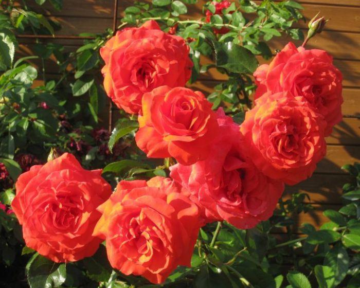 Роза Salita - роза с очень ярким, пылающим оранжево-алым цветом. Цветки средних размеров (8-9 см), большие, элегантные, махровые, по форме похожи на чайно-гибридные розы, появляются по одному или в небольших пышных кистях. Они красиво оттеняются темной блестящей листвой. Молодые побеги насыщенно-пурпурные. Куст достигает 3 м высоты, полтора метра ширины и цветет практически непрерывно. Сорт устойчив к болезням.