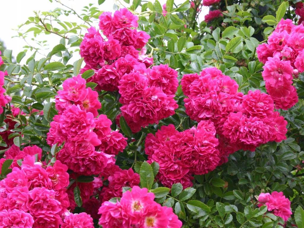 Роза Excelsa - мелкие, диаметром 3см, ярко-малиновые, густомахровые (70-90 лепестков), стойкие цветки. Появляются в плотных соцветиях по 40 штук. Кусты розы очень сильнорослые (до 4 м), с тонкими, стелющимися побегами, покрытыми темно-зелеными, блестящими листьями. Высокая зимостойкость.