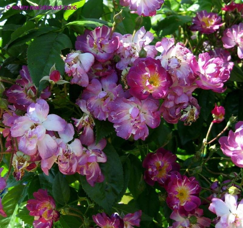 Роза Veilchenblau - цветки пурпурно-фиолетовые с белыми прожилками и серединой, мелкие (3,5 см), полумахровые (30-40 лепестков), появляются в огромном количестве (10-30шт) в крупных кистях. Куст мощный, сильнорослый с прочными побегами, практически без шипов, высота растения 3 - 4 м, размер куста 300 х 150 см. Лист светло-зеленый, крупный, устойчив к заболеваниям. Очень зимостойкое и выносливое растение.