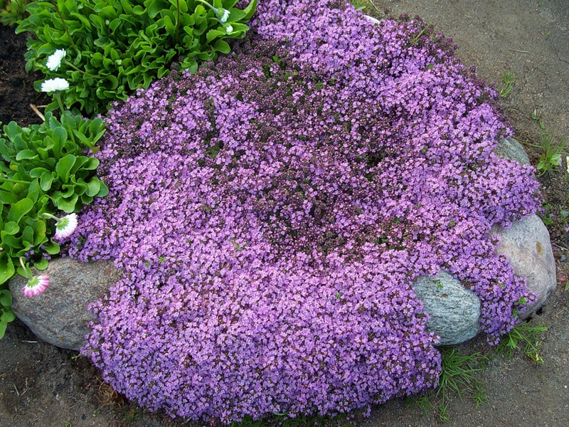 Тимьян ранний Карликовый - отличается невысоким ростом, взрослое растение достигает всего 3 сантиметров в длину, образуя густой покров. Листья на тонких побегах, мелкие насыщенного зеленого цвета. Особенно декоративен с мая по июль, когда распускается множество миниатюрных розовых цветочков, составляя живописную компанию листве. Лучше всего посадить тимьян на хорошо освещенные участки, так как в тени его цветение заметно ухудшается. Почва необходима легкая, плодородная и достаточно дренированная. Не прихотлив в уходе и не требует дополнительного укрытия на зиму.