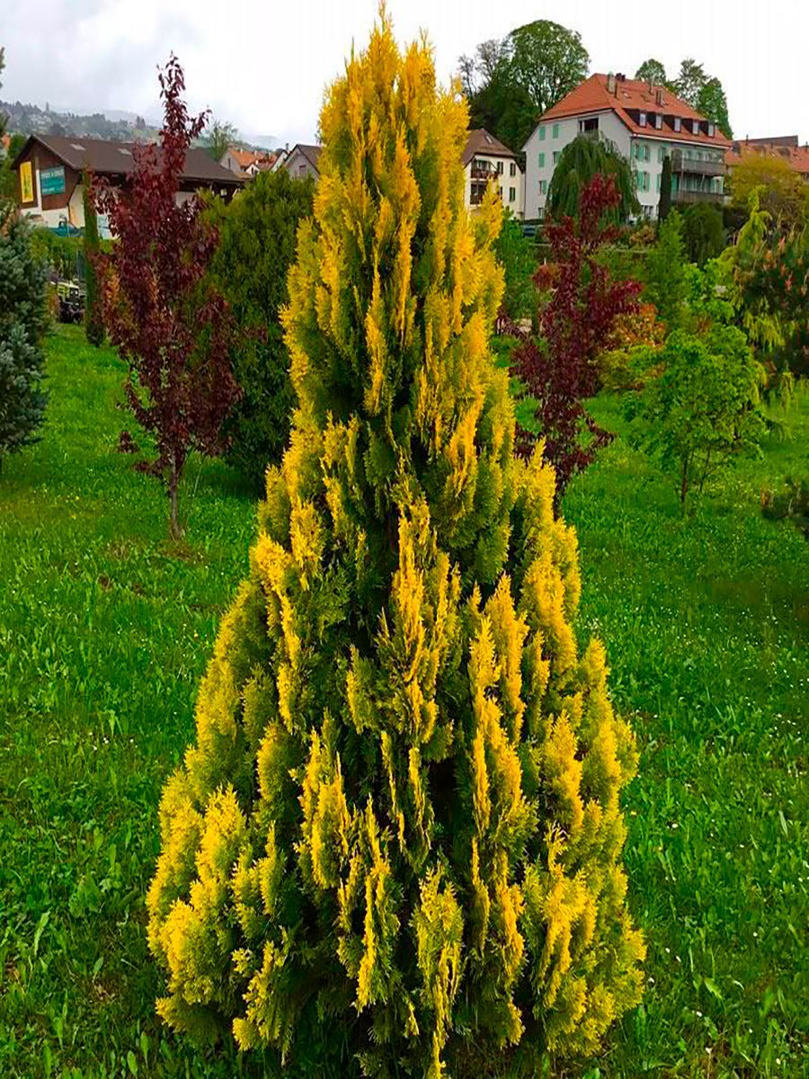 Небольшое хвойное деревце с конической кроной. Растет медленно. В 15 лет достигает высоты 2м и 0,8м в диаметре. Характерная особенность сорта – ярко-желтые (почти оранжевые) побеги текущего года, которые делают деревце ярким солнечным акцентом на фоне темно-зеленой и голубоватой листвы других хвойных и лиственных растений. Позже листва становится светло-зеленой, а при подготовке к зиме приобретает бронзовый оттенок.