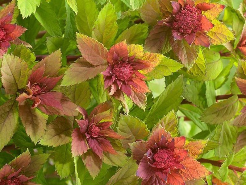 Декоративный кустарник. Весной новые листья ярко розово-красные, в дальнейшем цвет превращается в зеленый лайм. Листья не страдают от солнца.